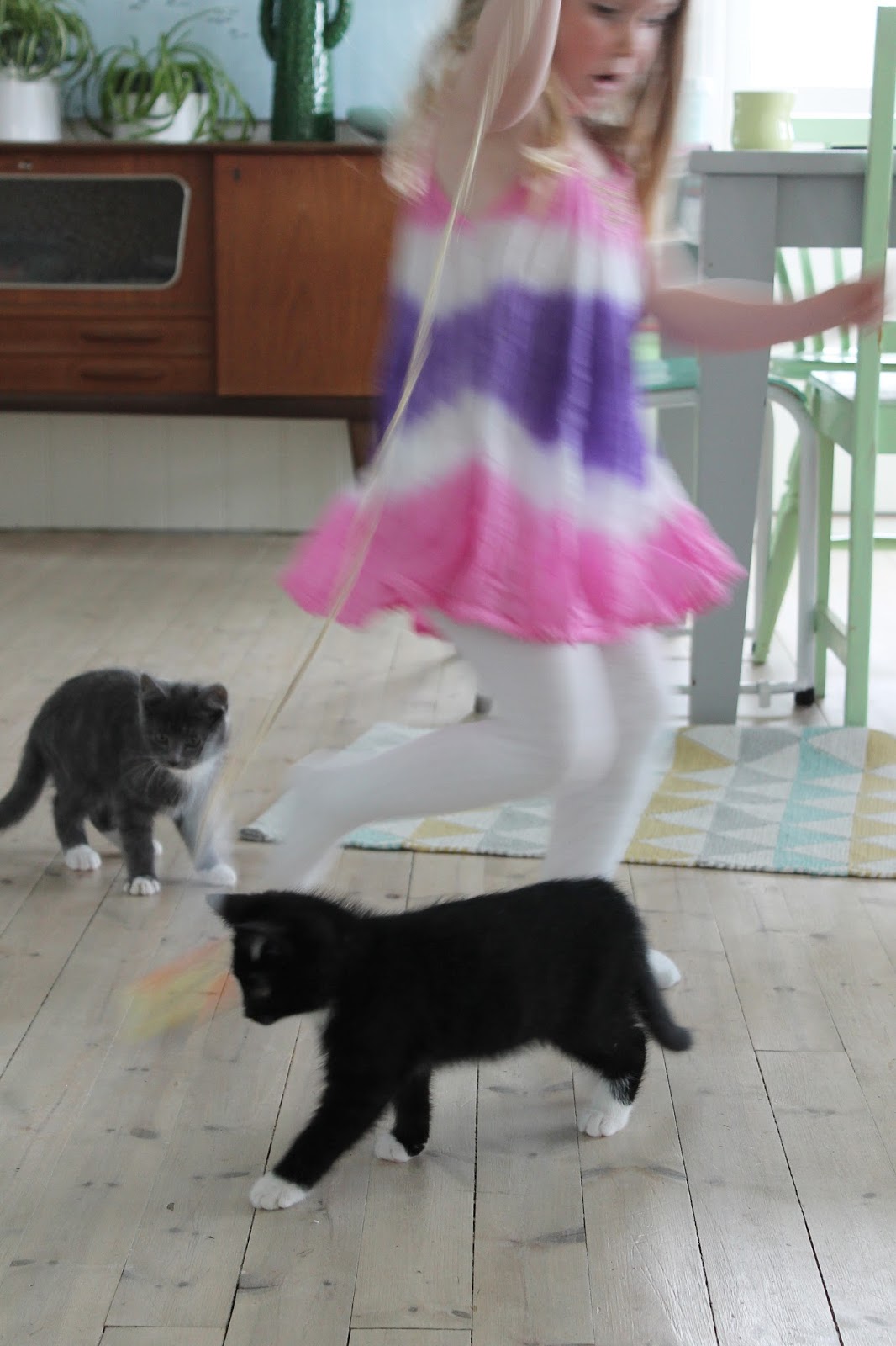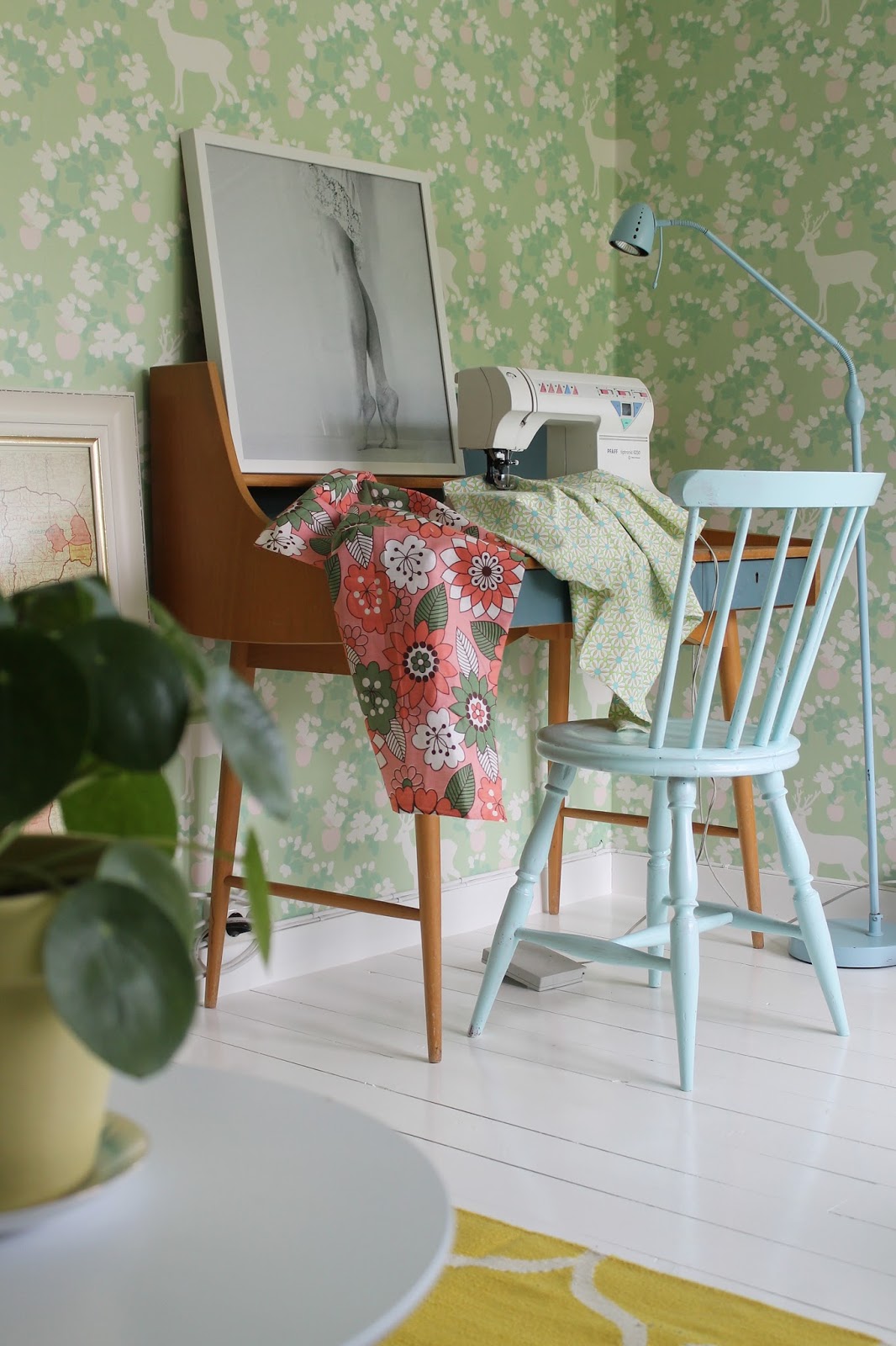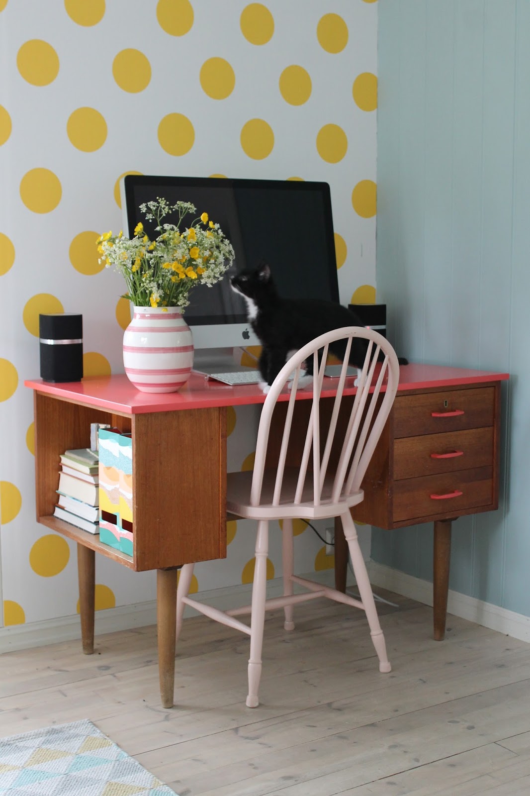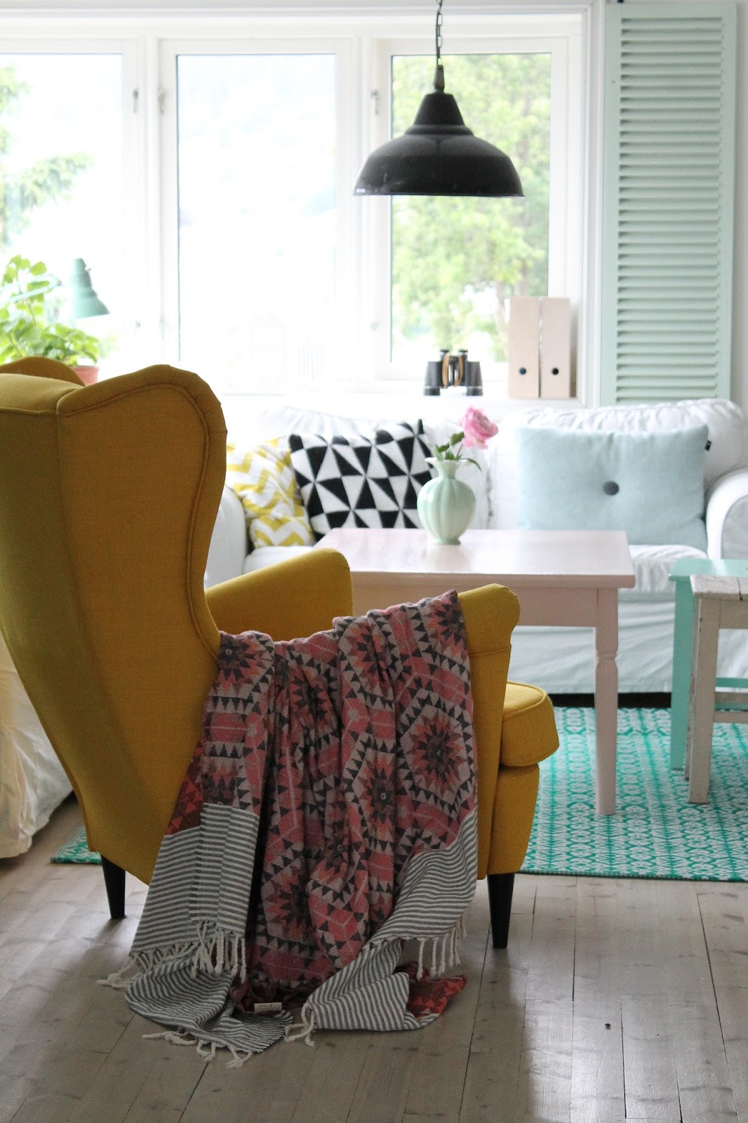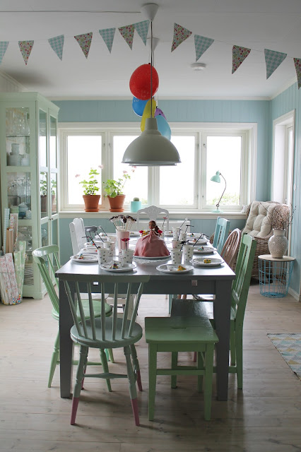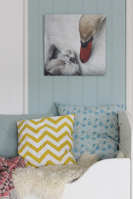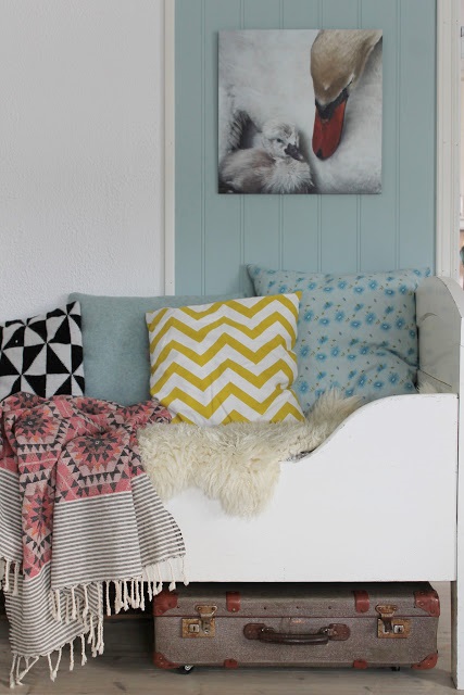 Når vi flytta inn i huset vårt var alt kvitt. Eg brukte litervis med kvitmåling på møbler og vegger. Men så skjedde noko eg ikkje hadde forutsett; eg vart hekta på farger. Først i form av små drypp med lyse pasteller, så kom turkis og gult for å friske opp. Måle gjer eg framleis, men det er sjelden eg har kvitt på penselen. Møbler og etterkvart vegger blir meir og meir fargeglade hos oss. Det er noko forfriskande ved å omgje seg med farger! Terapi rett og slett :)